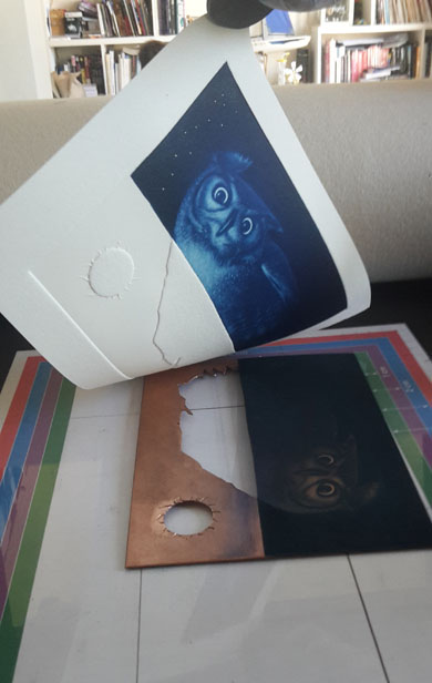 L'impression est le transfert de l'image de la matrice sur le cuivre. Dans le cas de l'image présentée, le cuivre a été decoupé. Lors de l'impression, le vide laissé sera traduit par un relief appelé 'embossage'. Pour l'impression, le papier utilisé est un papier généralement de 300g/m2 : il est épais et doit être de bonne qualité. Il est généralement trempé une bonne nuit avant utilisation afin de le rendre plus apte à rentrer dans le cuivre. La première étape de l'impression est l'encrage et l'essuyage de la plaque. |