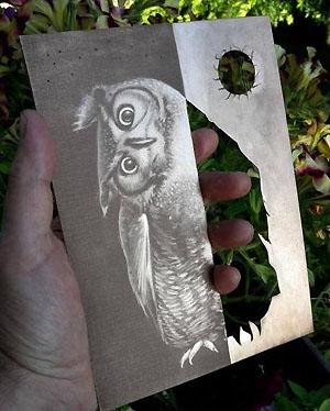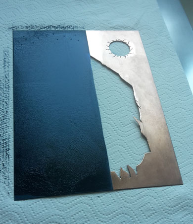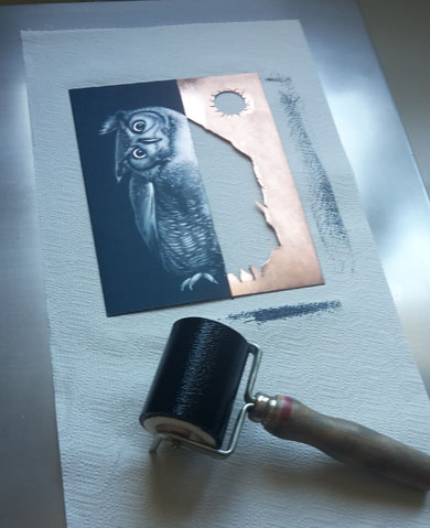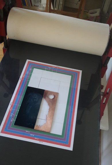 L'impression est le transfert de l'image de la matrice sur le cuivre. Dans le cas de l'image présentée, le cuivre a été decoupé. Lors de l'impression, le vide laissé sera traduit par un relief appelé 'embossage'. Pour l'impression, le papier utilisé est un papier généralement de 300g/m2 : il est épais et doit être de bonne qualité. Il est généralement trempé une bonne nuit avant utilisation afin de le rendre plus apte à rentrer dans le cuivre. La première étape de l'impression est l'encrage et l'essuyage de la plaque. |