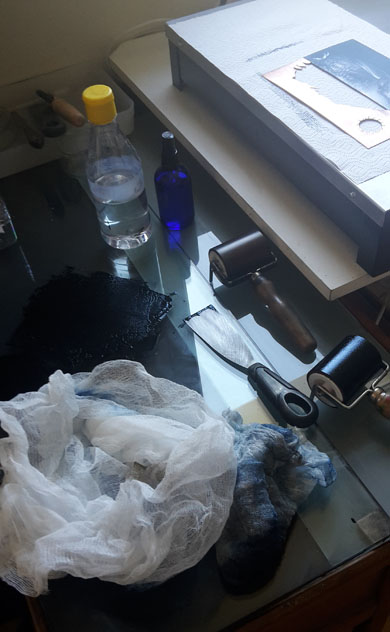 Afin d'enlever l'encre en trop en surface et de faire réapparaitre le dessin, on utilise plusieurs méthodes. La principale fait intervenir une gaze de tissus appelée 'tarlatane'. Les essuyages successifs se font délicatement afin de ne pas abimer le cuivre et surtout de ne pas enlever l'encre en profondeur. |